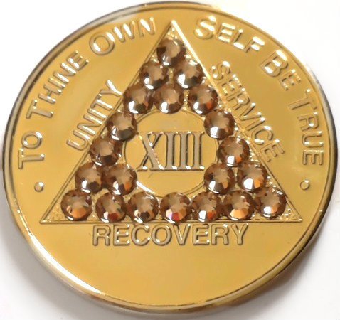 Genuine Swarovski crystals in ‘light colorado topaz’ on gold plated medallion. Available in 24 hr, 1 month, 2 month, 3 month, 6 month, 9 month, 18 month, and years 1 through 56.